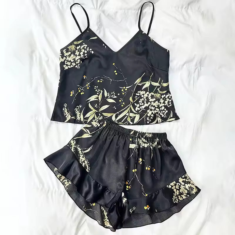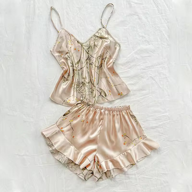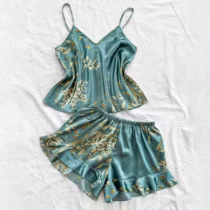 The fabric drapes beautifully with a gentle sheen, offering that smooth, satin-touch comfort that feels indulgent without trying too hard. Wear the slip under the robe for a romantic, feminine look or pair the vest and shorts for something light and playful. Every piece moves with you, giving you a lounge set that feels as elegant as it looks.