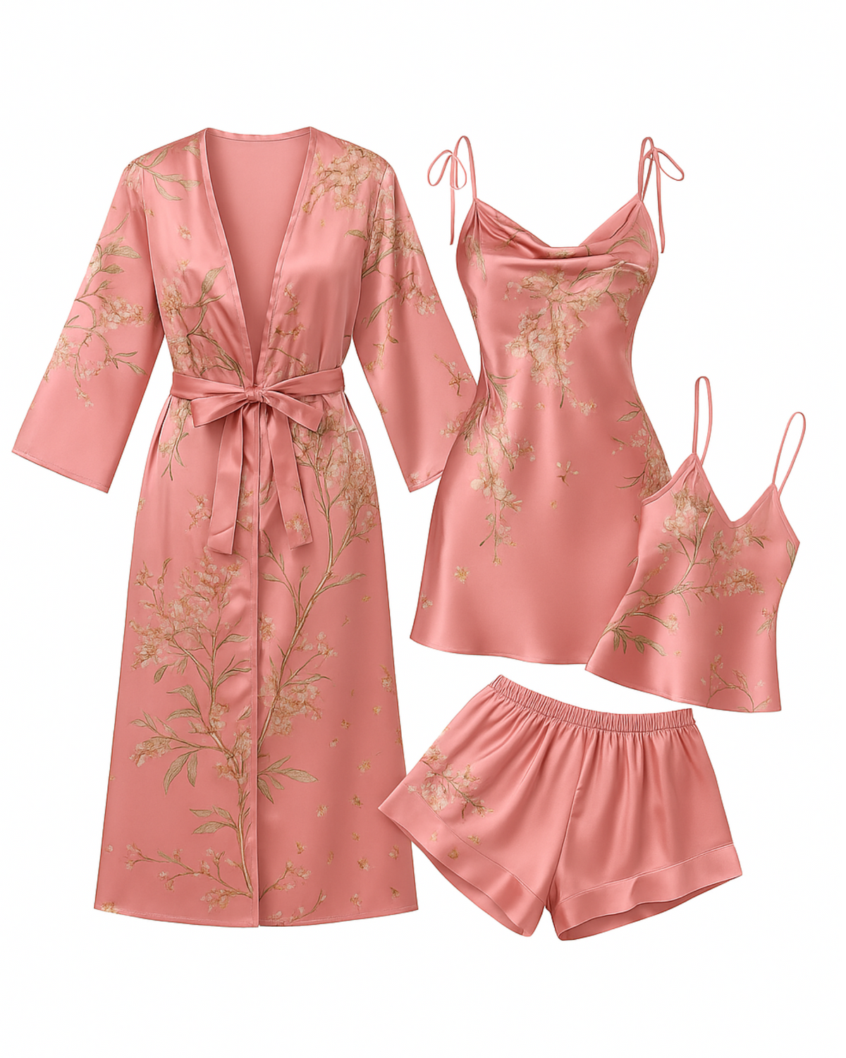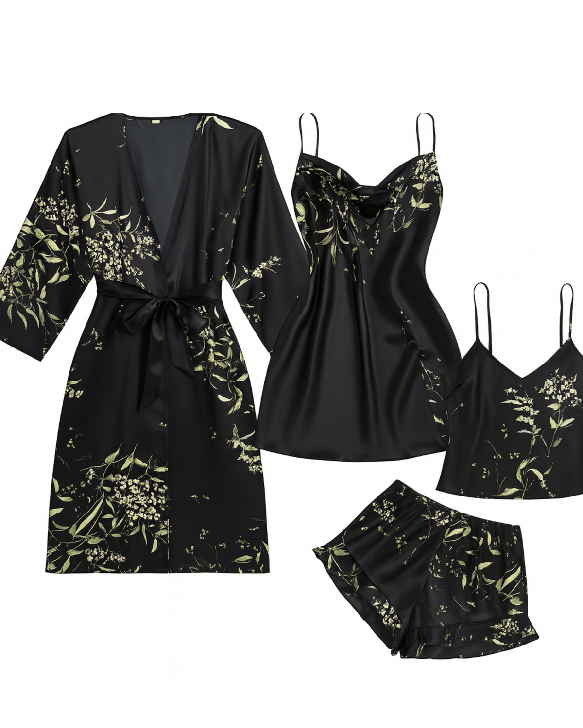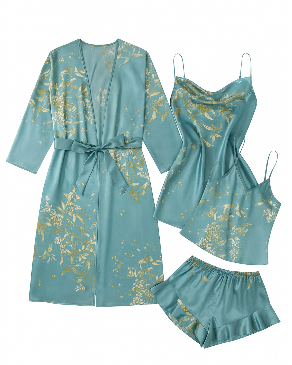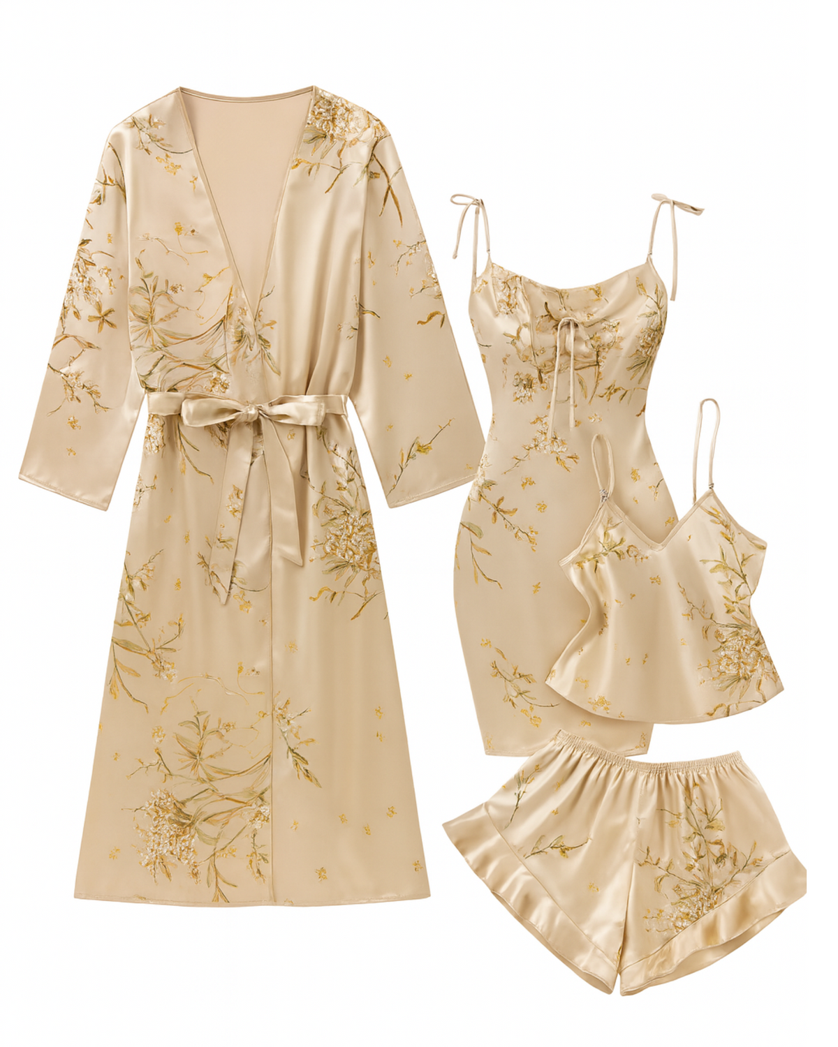 Unwind in effortless luxury with the 4 Piece Sultra Lounge Set, designed for slow mornings, soft evenings, and everything in between. This silky, fluid set features a flowing robe, a delicate slip dress, a relaxed vest, and matching shorts, giving you endless ways to style your downtime.