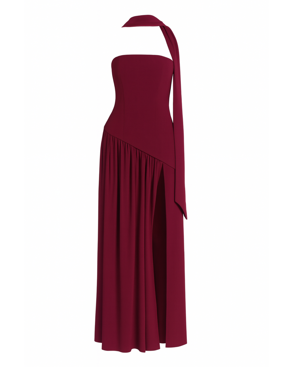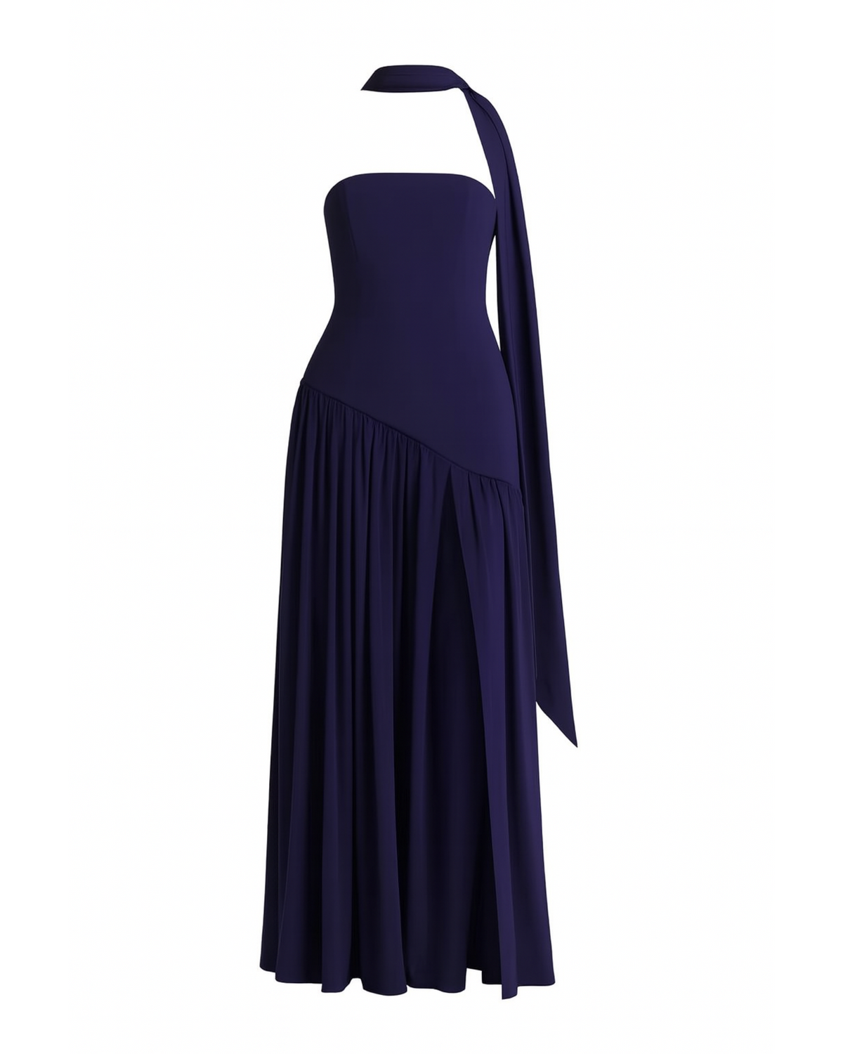 The Stella Maxi Dress is a soft, sculpting silhouette designed for effortless elegance. This strapless gown skims the body and falls into a flowing floor length hem with a thigh-high split that adds ease and movement.